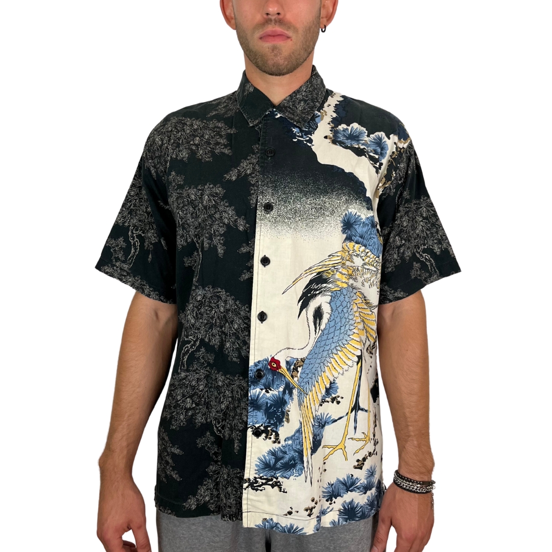 Camicia Aironi traditional 100% cotone del marchio No Boundaries. Colore predominante blu scuro con splendido disegno di aironi col0rati. Fondo di ispirazione naturale. Perfetta per chi cerca una vestibilitร over.