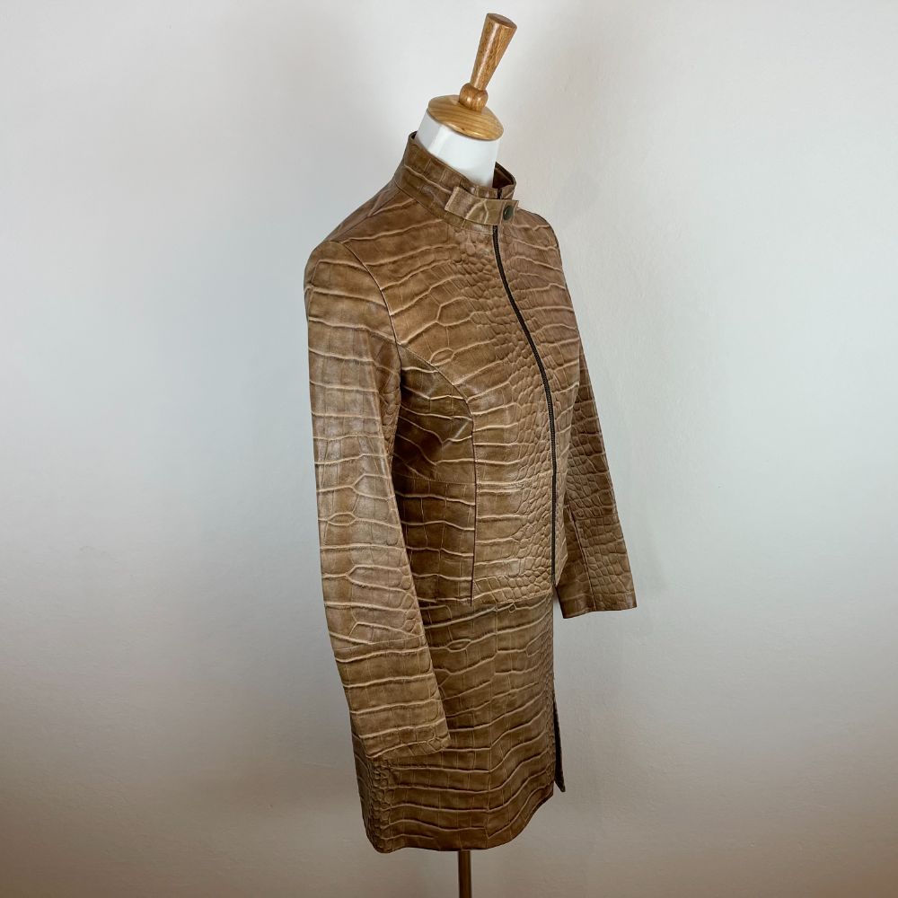 Completo in vera pelle stampa coccodrillo. Comprende giacca e gonna nello stesso materiale e fantasia: giacca avvitata con zip frontale e bottone a pressione; gonna con spacchetto sulla cosci, si chiude con una zip laterale e fettuccia con bottoni a pressione a scopo decorativo. Entrambi i pezzi sono fatti in vera pelle all’esterno e fodera in viscosa all’interno.