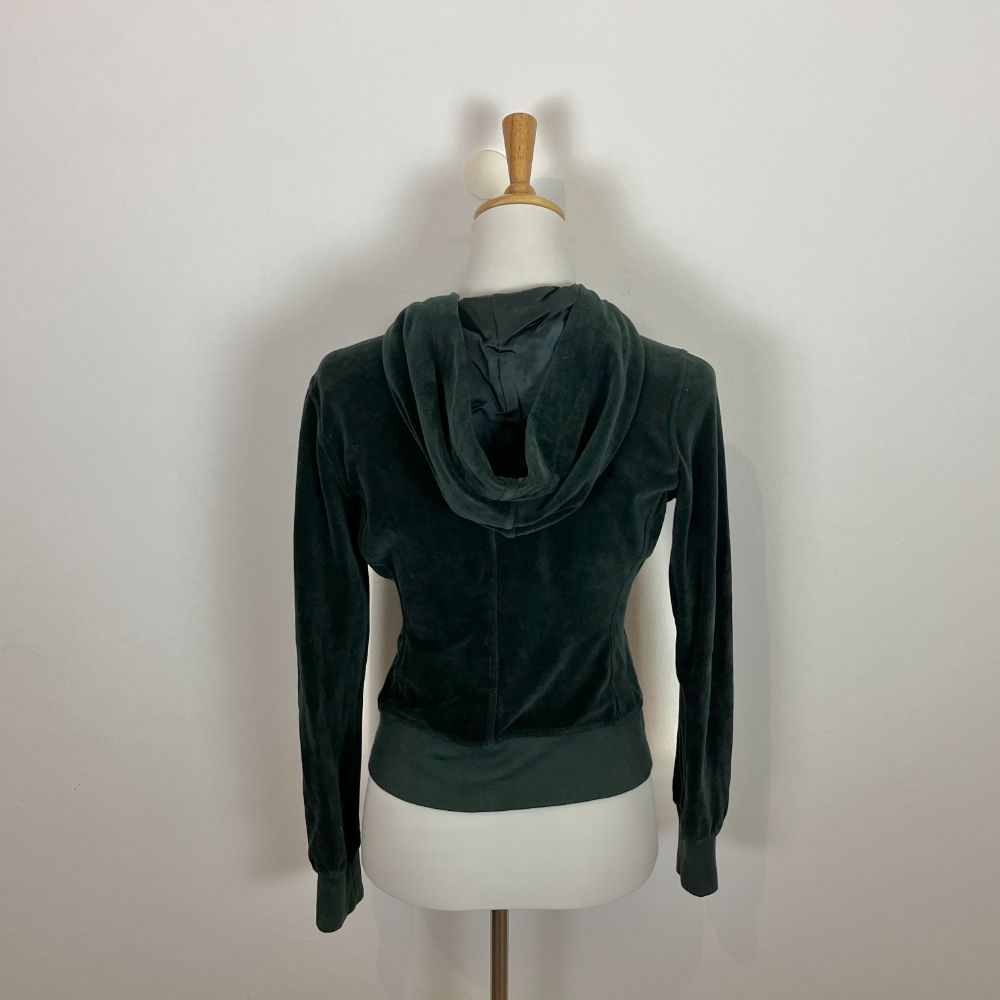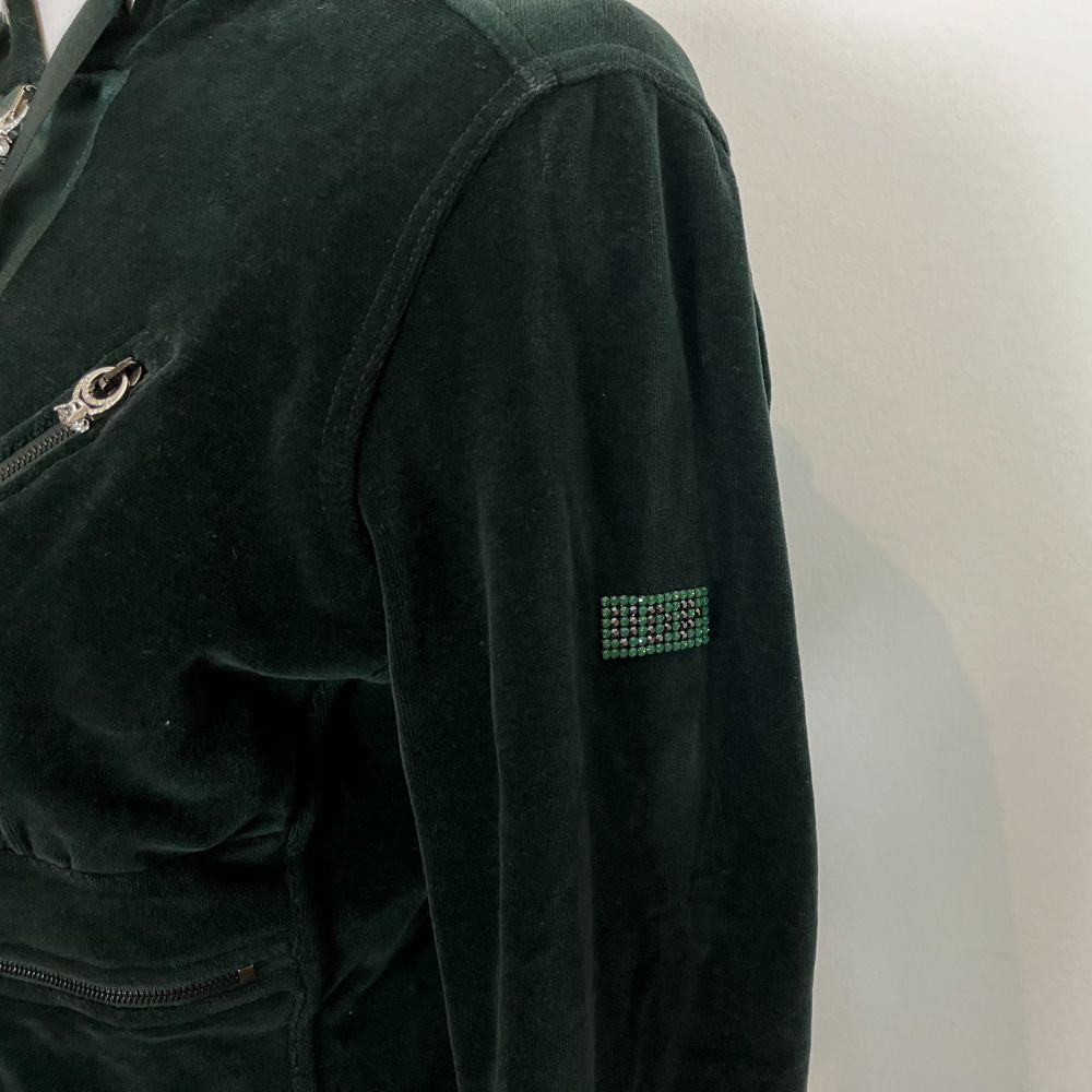 Felpa Y2K VDP Club in velluto di cotone verde e profili in raso di viscosa. Particolare felpa crop con cappuccio e tanti dettagli che non passano inosservati! Nastro di raso per regolare il cappuccio, 6 tasche sul front con zip con tiretto a forma di anello con diamante. Idem per la chiusura. Elasticizzata, fit aderente.