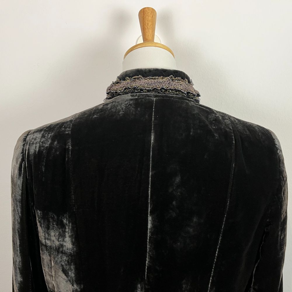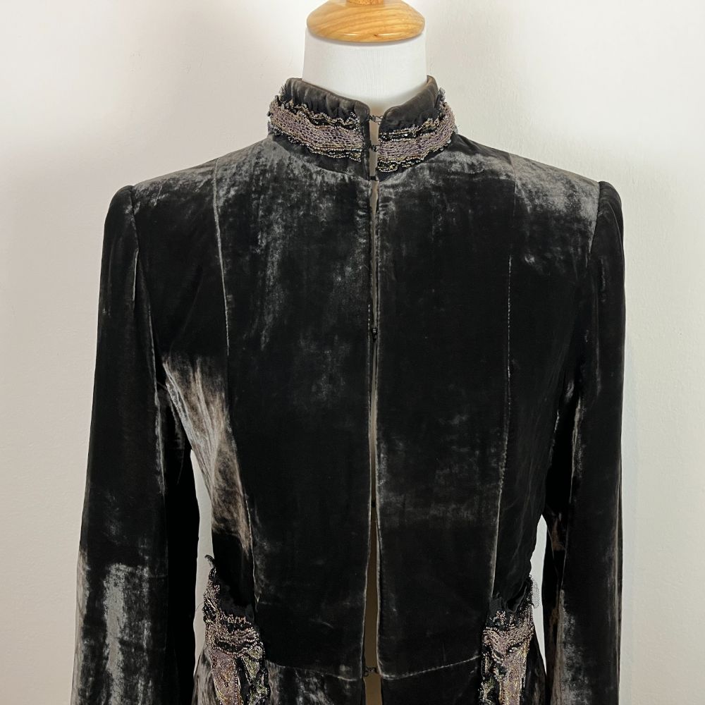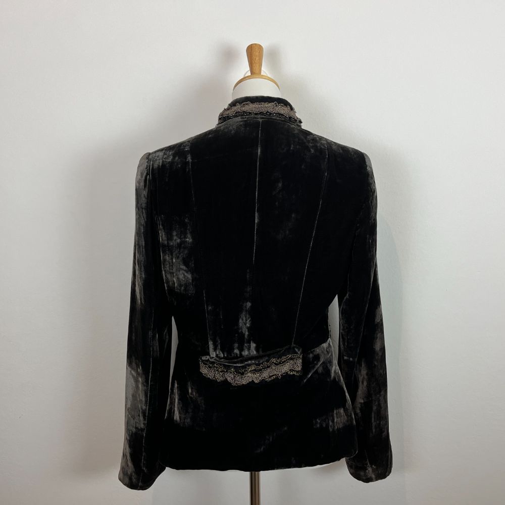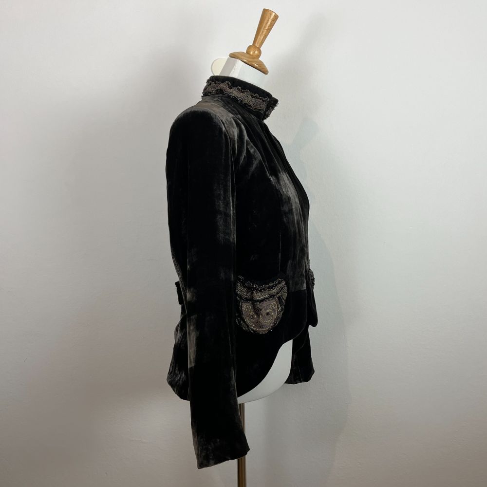 Giacca velluto cangiante del marchio Love, Sex, Money. Velluto di viscosa e seta dal particolarissimo effetto riflettente. Giacca avvitata con taglio retrรฒ e collo medio-alto. Colore marrone scuro che cambia in base alla luce. Splendide decorazioni in pizzo e perline dal sapore anni 20 sia sul collo che sulle due taschine frontali. Con spalline interne. Abbottonatura con gancetti.