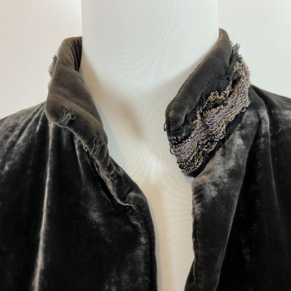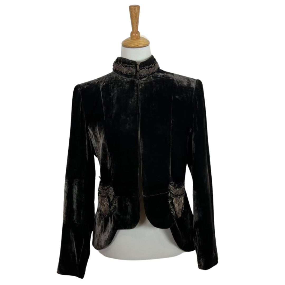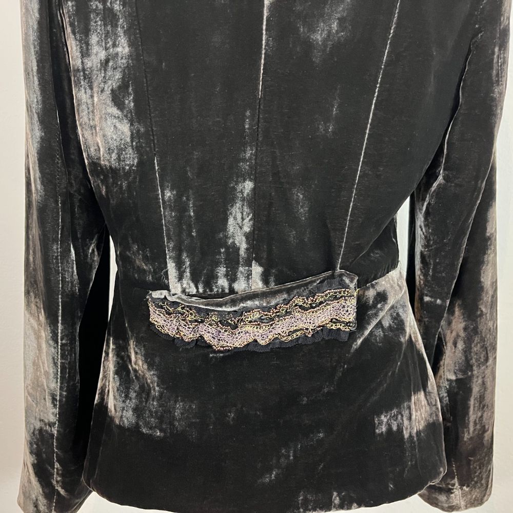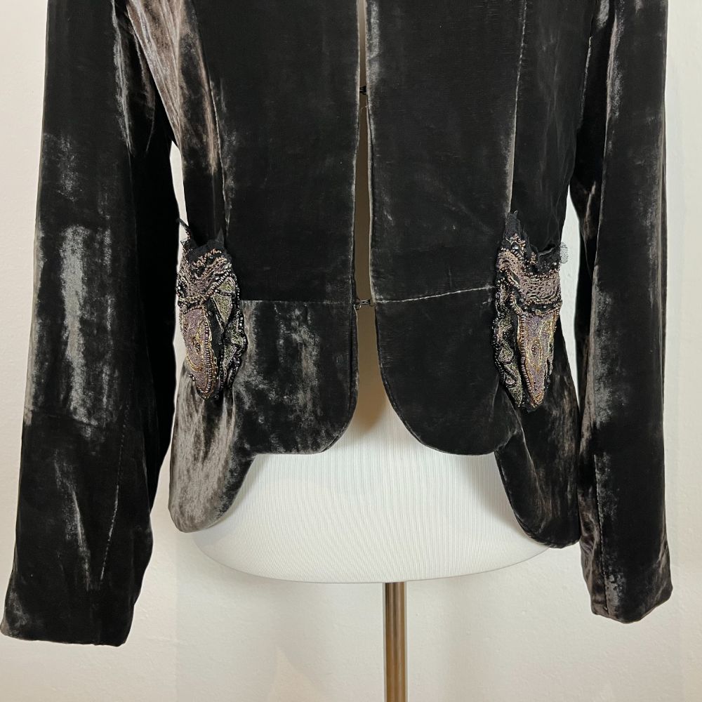 Giacca velluto cangiante del marchio Love, Sex, Money. Velluto di viscosa e seta dal particolarissimo effetto riflettente. Giacca avvitata con taglio retrรฒ e collo medio-alto. Colore marrone scuro che cambia in base alla luce. Splendide decorazioni in pizzo e perline dal sapore anni 20 sia sul collo che sulle due taschine frontali. Con spalline interne. Abbottonatura con gancetti.