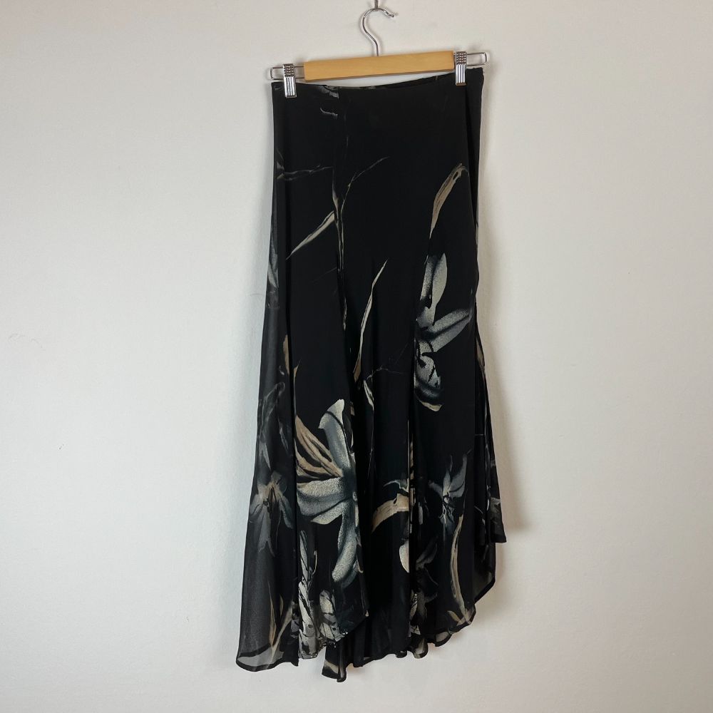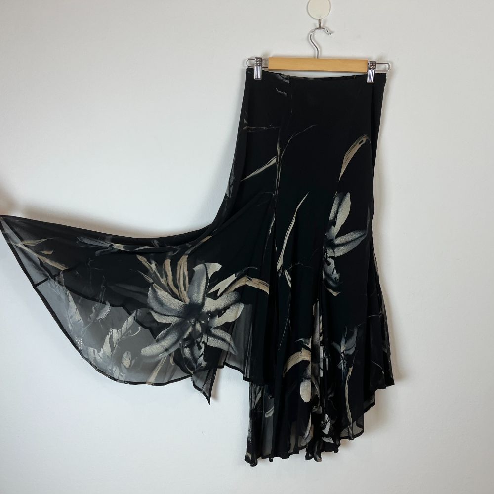 Gonna Anna Rachele Made in Italy, asimmetrica con fantasia floreale. Gonna leggerissima a strati di colore nero con fantasia beige e grigia. Vita elasticizzata
