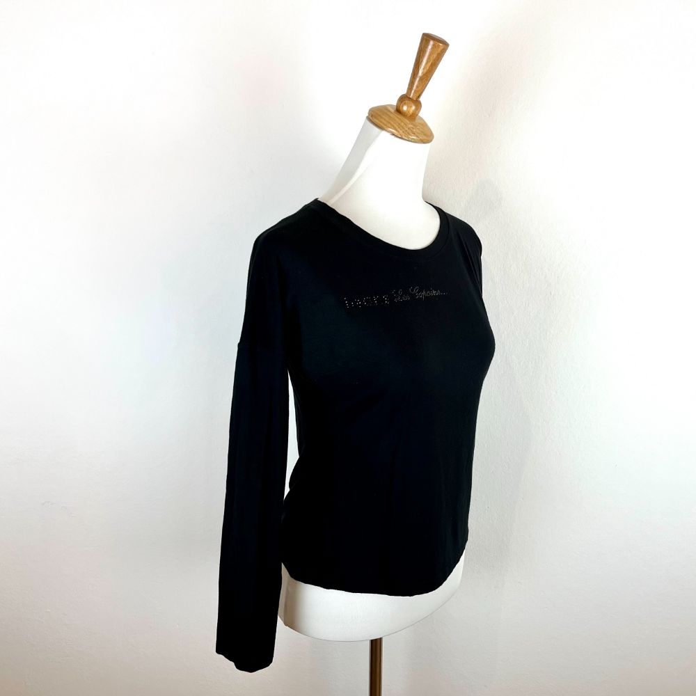 Maglia Jeans Les Copains nera a manica lunga. Scritta Jeans Les Copains in strass sul fronte, fit particolare: oversize zona petto, slim zona ventre. Made in Italy