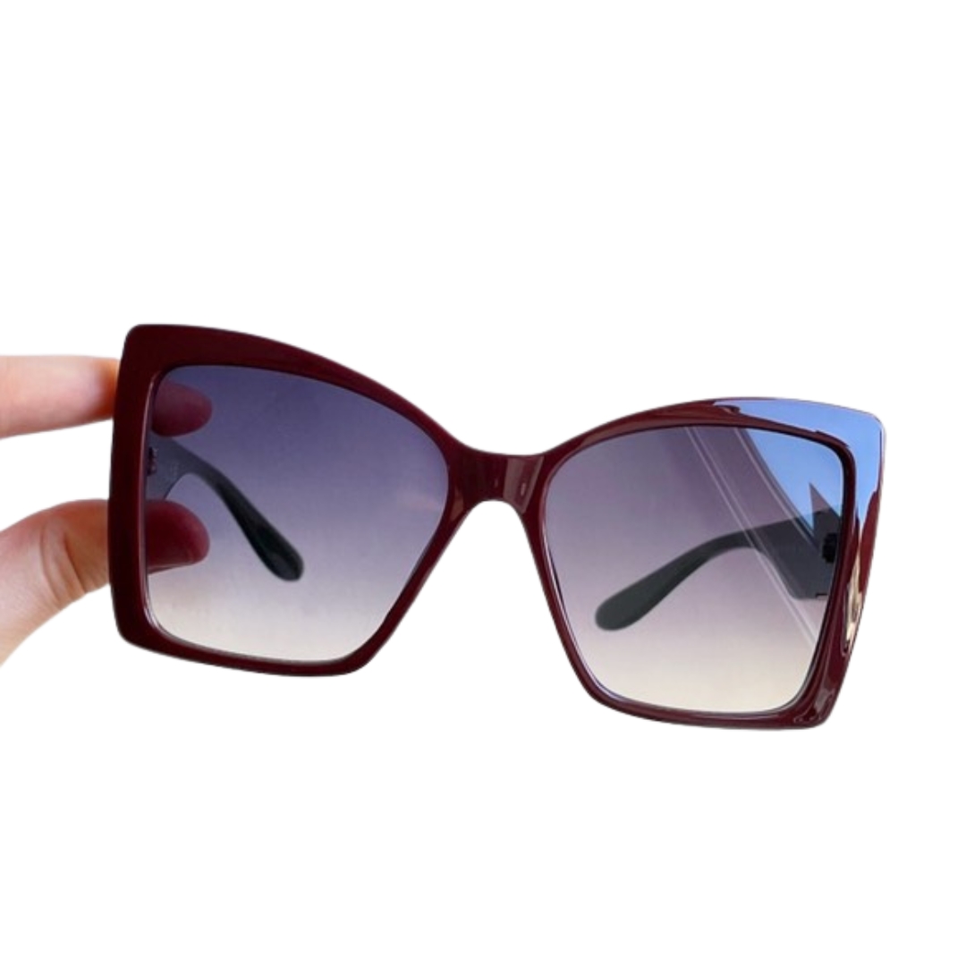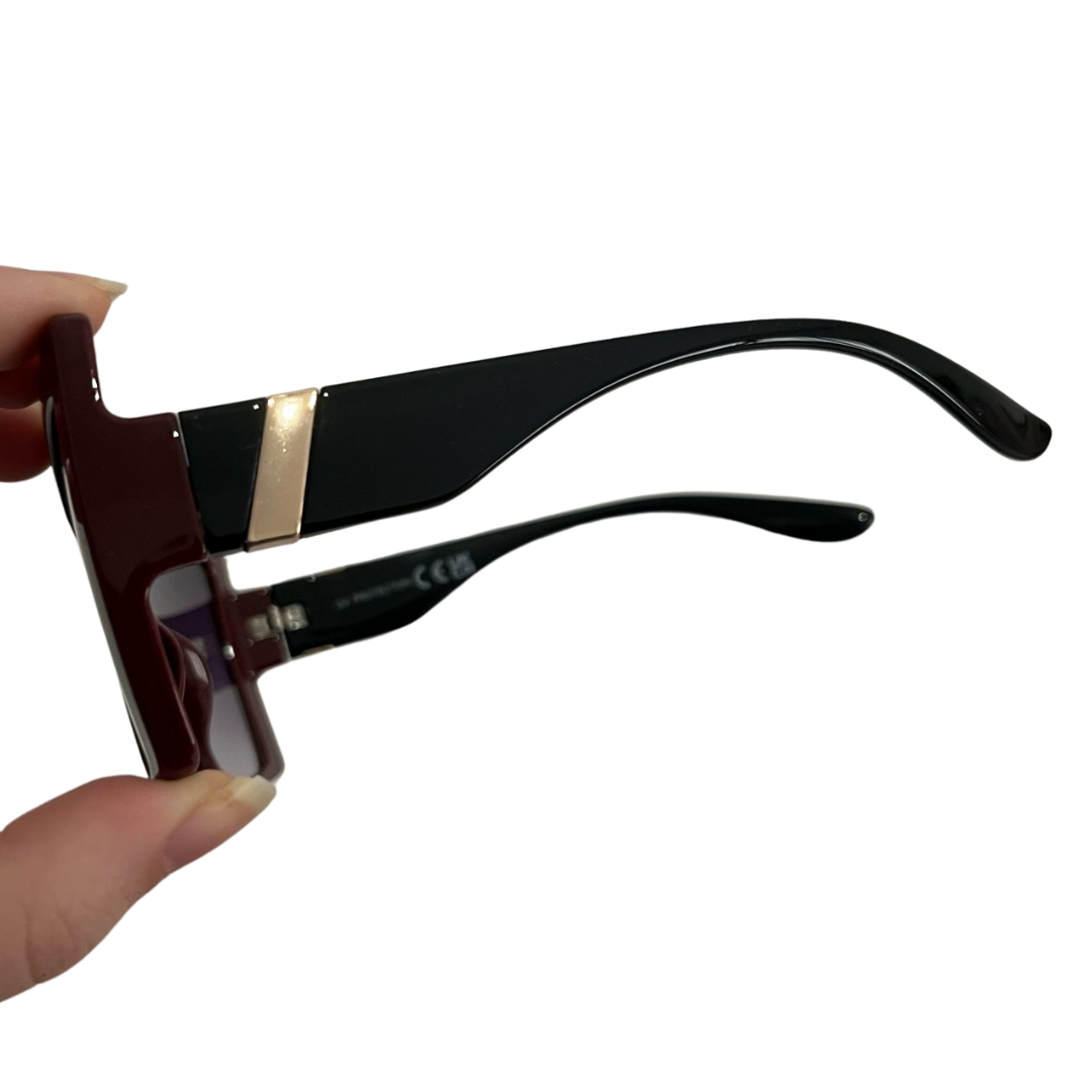 Occhiali vintage Farfalla. Occhiali da sole con montatura color bordeaux, lenti nere con protezione UV e aste nere con dettaglio metallico color oro. Spediti con custodia morbida per occhiali.