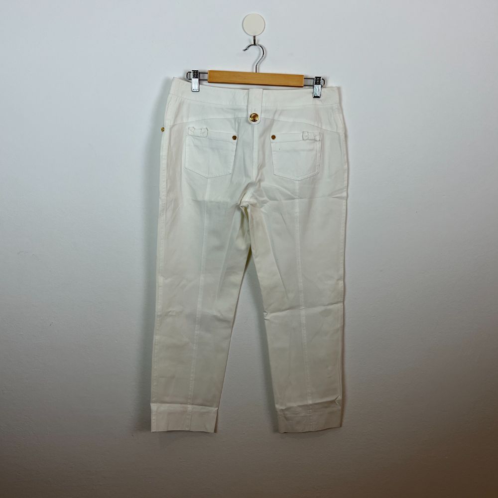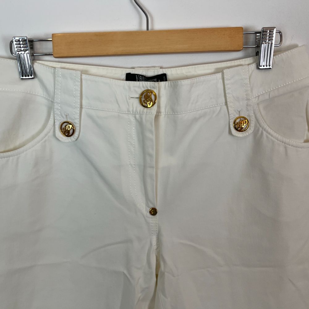 Pantalone capri VDP Collection di colore bianco con inserti gioiello. Meraviglioso capri dotato di ologramma di sicurezza che ne attesta l’autenticitร . 4 tasche e 3 passanti per eventuale cintura, presenta dettagli gioiello dorati che lo rendono ideale per ogni tipo di look, da casual all’elegante. Perfetto per l’estate, sul retro riporta due piccoli fiocchi sulle tasche. Leggermente elasticizzato.