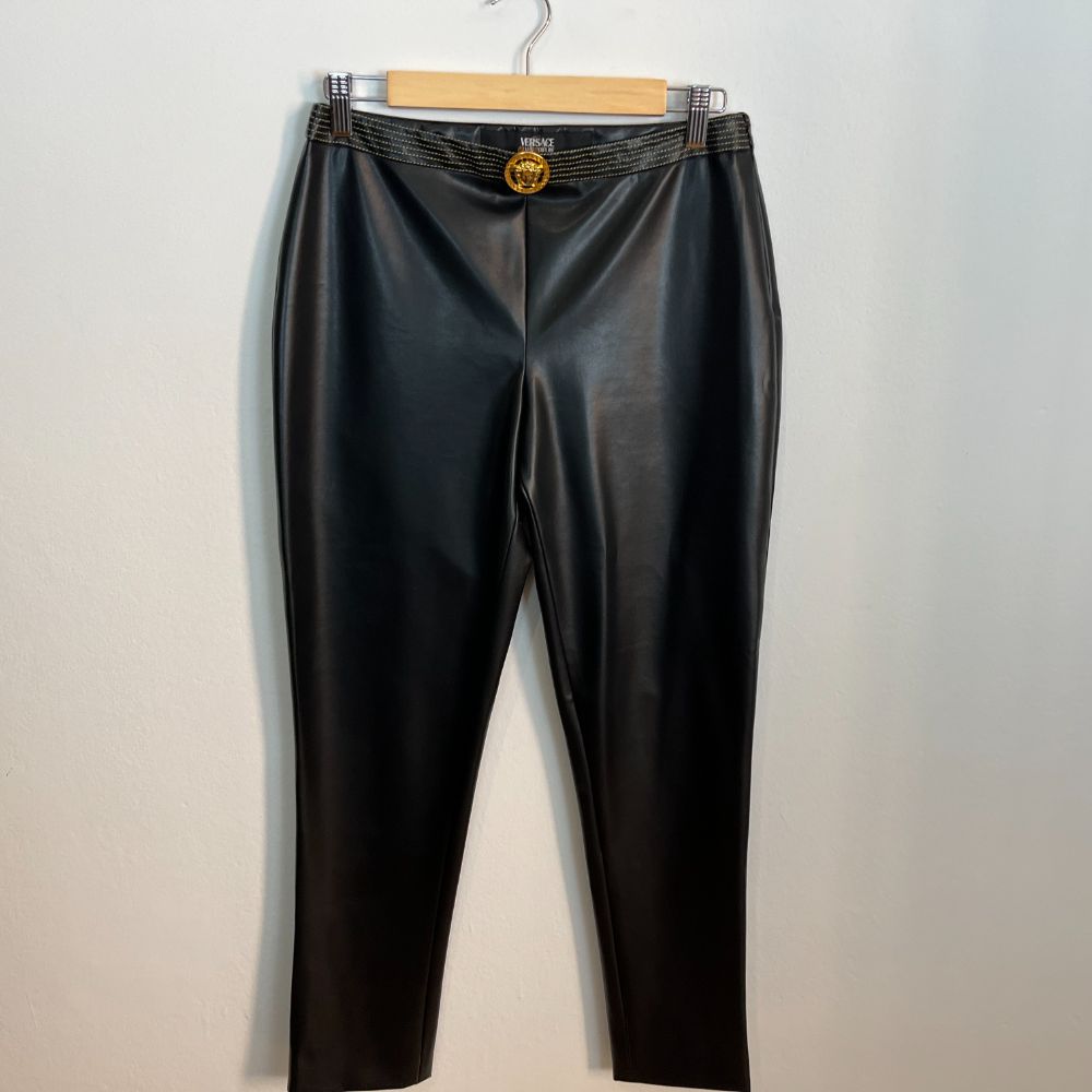 Pantalone Versace Jeans Couture con Medusa gioiello sul fronte. Comodo pantalone stile y2k in finta pelle, nero, ideale per ogni tipo di look. Modello a sigaretta.