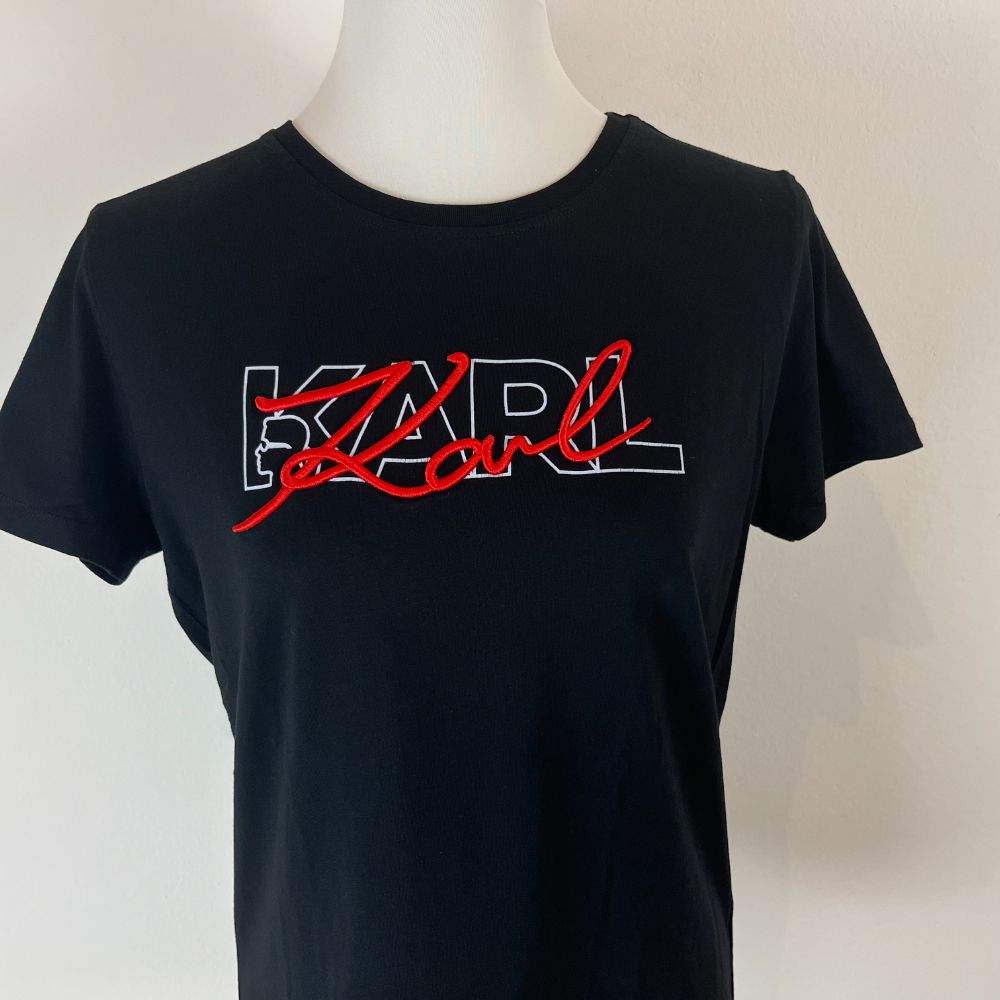 T-Shirt Karl Lagerfeld nera con logo bianco e firma “Karl” ricamata di rosso.
